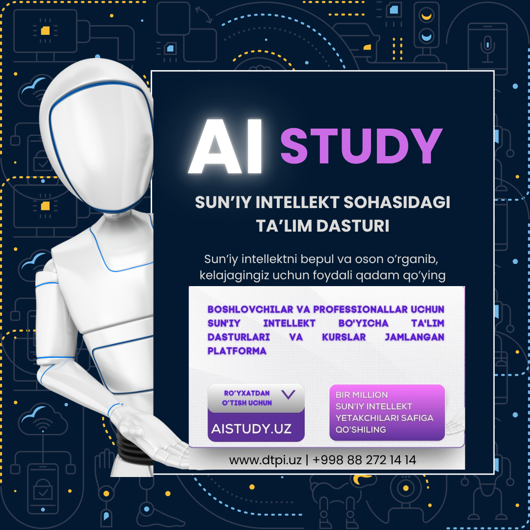 AI STUDY platformasi Denov tadbirkorlik va pedagogika instituti talabalari hamda barcha yoshlar uchun sun’iy intellekt sohasida boshlang‘ichdan professionalgacha bo‘lgan ta’lim kurslarini taklif etadi.