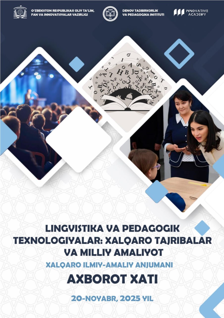 Sizni 2025-yil, 20-noyabr kuni soat 9:30 da bo‘lib o‘tadigan Xorijiy til va adabiyoti quyi va yuqori kurslar kafedralari tomonidan tashkillashtirilgan “Lingvistika va pedagogik texnologiyalar: xalqaro tajribalar va milliy amaliyot” mavzusidagi xalqaro ilmiy-amaliy konferensiyada ishtirok etishga taklif etamiz.
