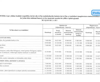 Yangiliklar Davlat oliy taʼlim tashkilotlarida bitta talabani bazaviy toʻlov-kontrakt asosida bir yillik oʻqitish qiymati miqdorlari (bakalavriat, magistratura) 22/09/2025