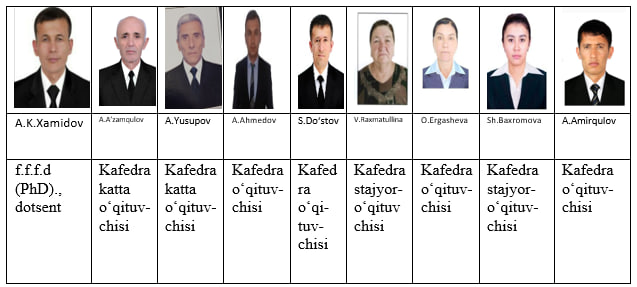 Kafedrada 24 nafar professor-o‘qituvchilar faoliyat yuritadilar, jumladan, 3 nafar falsafa doktorlari (PhD), 1 ta dotsent ilmiy unvonli va 2 nafar katta o’qituvchi, 12 nafar o‘qituvchilardir. Ilmiy salohiyat 17 % ni tashkil etadi.