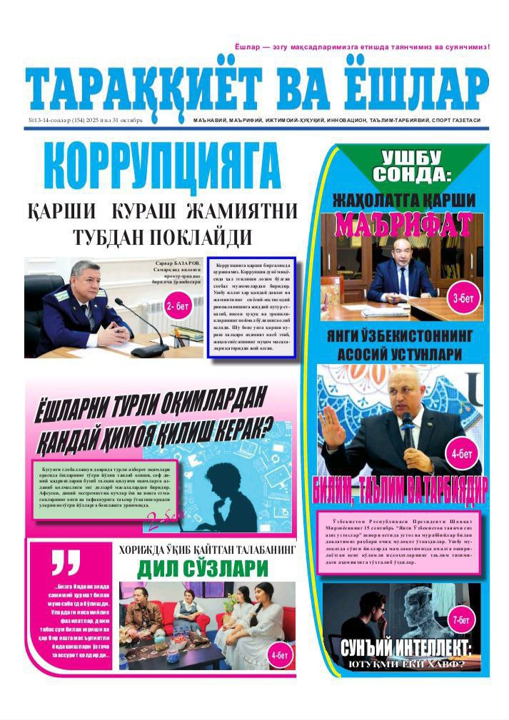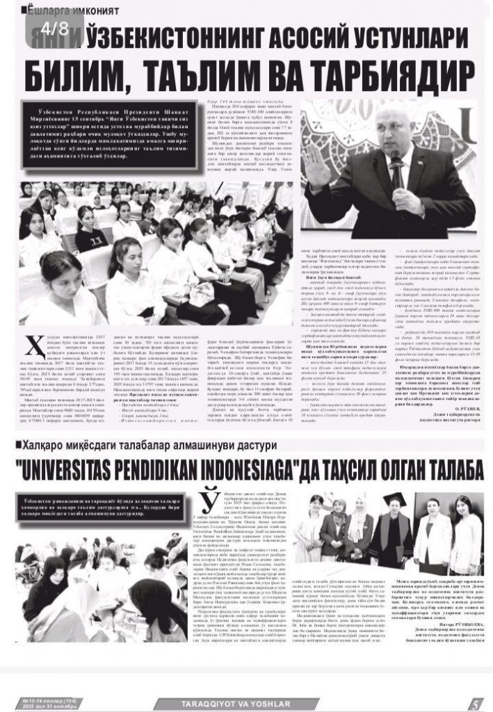 🔰 Denov tadbirkorlik va pedagogika instituti rektori, iqtisod fanlari nomzodi, dotsent Oybek Ro‘zievning “Yangi O‘zbekistonni asosiy ustuni bilim, ta’lim, tarbiyadir” deb nomlangan dolzarb mavzudagi maqolasi “Taraqqiyot va yoshlar” gazetasining joriy yil 30-oktabrdagi 13-14 qo‘shma sonlarida chop etildi.