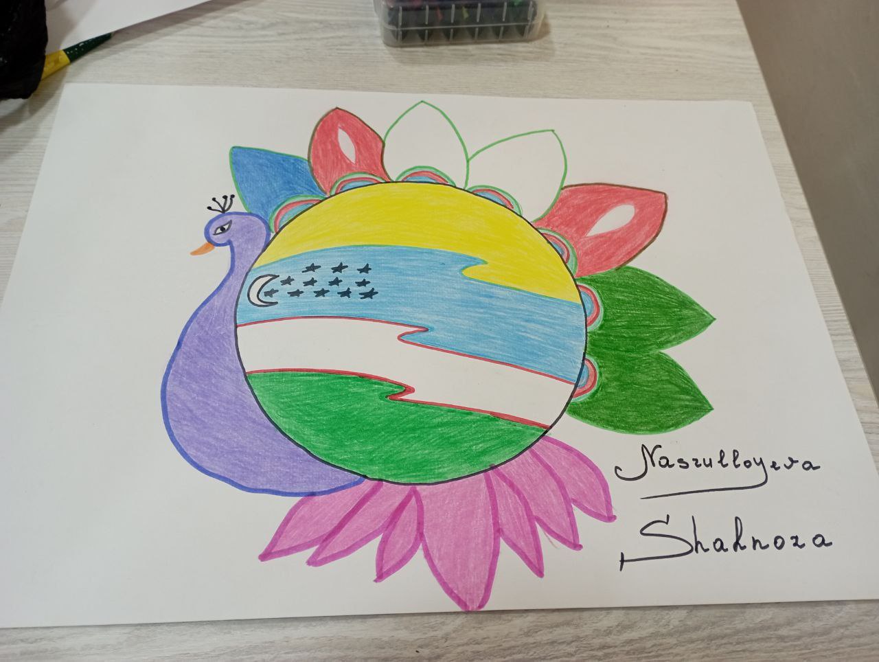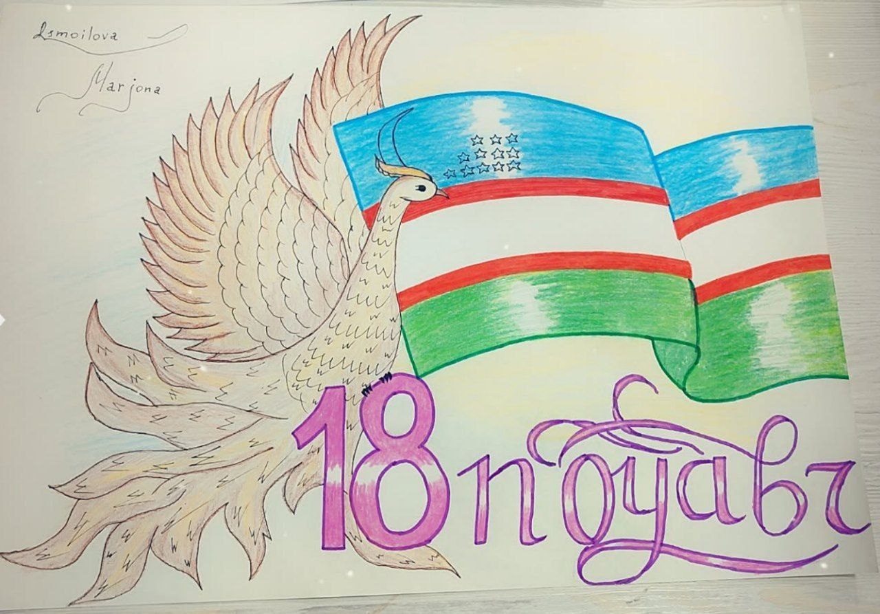 💫 Rang-tasvir orqali san’at namunalarini yaratgan talabalar davlat bayrog‘i, humo qushi tasviri orqali ezgu maqsadlari, orzu va intilishlarini aks ettirdilar.
