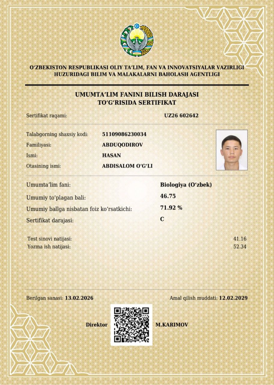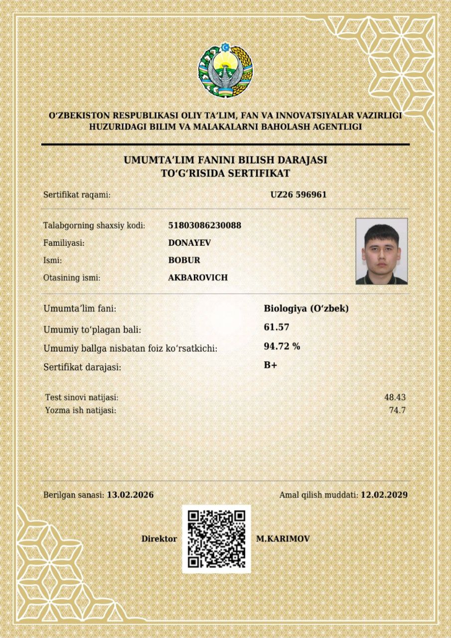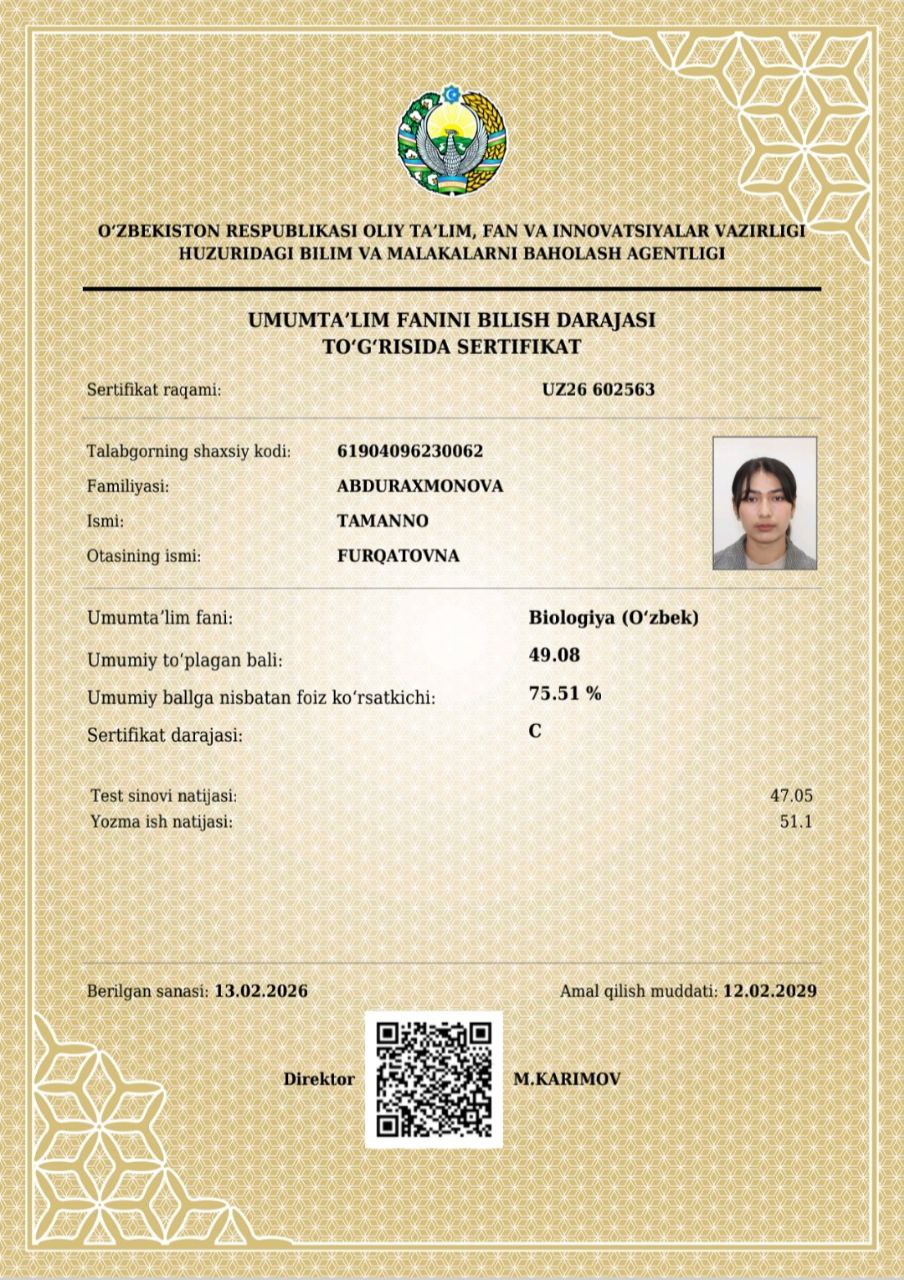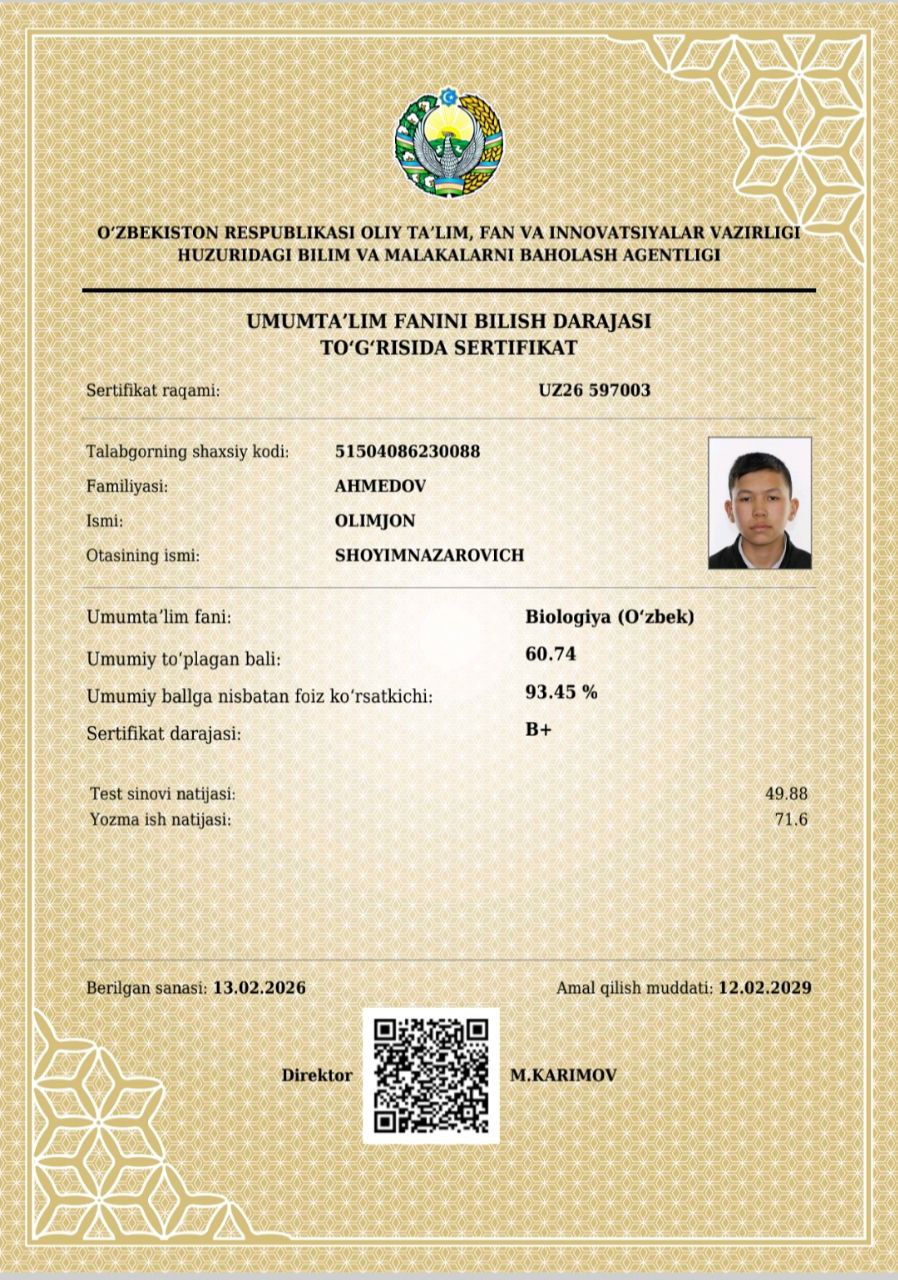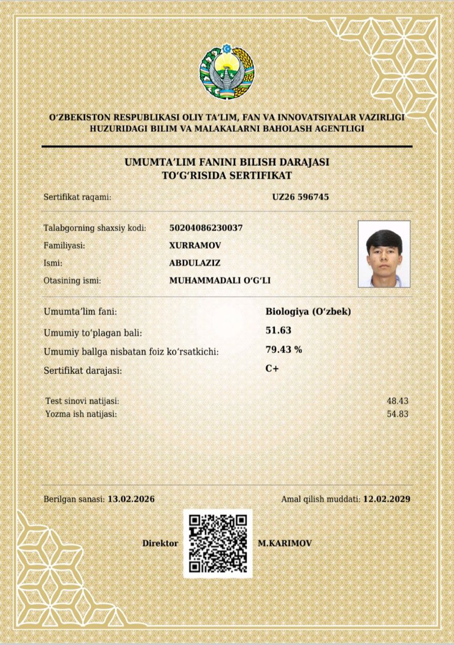 📌Mana bugun kafedraning malakali oʻqituvchisi A.Bolliyevning mashaqqatli mehnatlari natija berib, Denov tumanidagi 22-51-90-umumta’lim maktablarining 10-11-sinf o’quvchilar Abdurahmonova Tamanno, Ahmedov Olimjon, Donayev Bobur, Abduqodirov Hasan, Xurramov Abdulazizlar kursning dars mashgʻulotlarida faol qatnashib, umumtaʼlim fanlaridan Oliy ta’lim muassasalariga kirish imtihonlarida imtiyoz beruvchi milliy sertifikatlarga ega boʻlishdi.