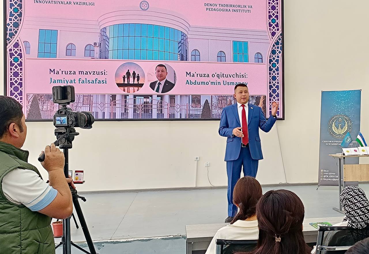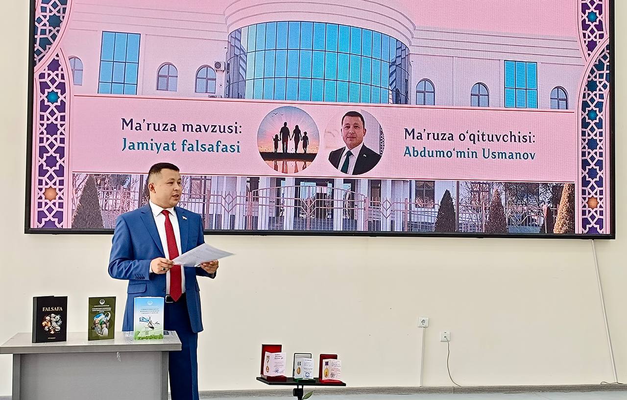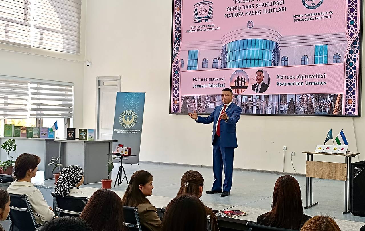 🏢 Denov tadbirkorlik va pedagogika instituti Tadbirkorlik va boshqaruv fakultetida “Tarix va falsafa” kafedrasi o’qituvchisi Abdumo’min Usmanov tomonidan Iqtisodiyot ta’lim yo’nalishi 2-kurs talabalariga Falsafa fanidan “Jamiyat falsafasi” mavzusida ochiq dars tashkil etildi.