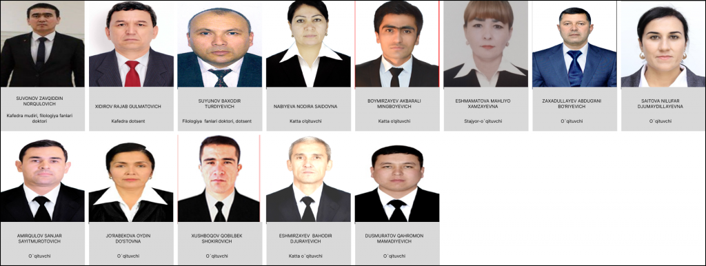 2 nafar fan doktori, 3 nafar falsafa fanlari doktori (PhD), 6 nafar katta o‘qituvchi, 6 nafar o‘qituvchi, 4 nafar assistent (stajyor-o‘qituvchi)