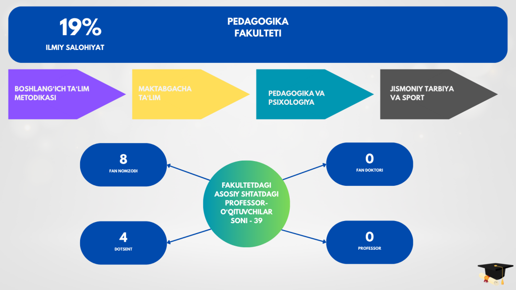 “Pedagogika” fakulteti jamoasi 2020–2025 yillar davomida samarali ilmiy-pedagogik faoliyat olib borib, bir qator yutuqlarga erishdi. Jumladan, ushbu davrda kafedra professor-o‘qituvchilari orasidan 1 nafar dotsent, 8 nafar pedagogika va psixologiya fanlari bo‘yicha falsafa doktori (PhD) ilmiy darajasini oldilar. 2 nafar doktarantura, 6 nafar mustaqil izlanuvchi ilmiy ishlari bo’yicha faoliyat olib bormoqda.