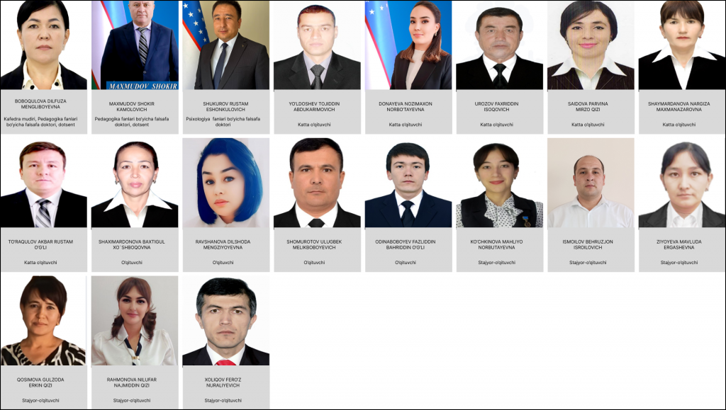 Kafedrada jami 20 nafar professor-o‘qituvchi faoliyat yuritmoqda. Ulardan 3 nafari fan nomzodlari va falsafa doktorlari (PhD), 2 nafari dotsent ilmiy unvoniga ega. Shuningdek, kafedra tarkibiga 6 nafar katta o‘qituvchi, 5 nafar o‘qituvchi va 6 nafar stajyor-o‘qituvchi kiradi.