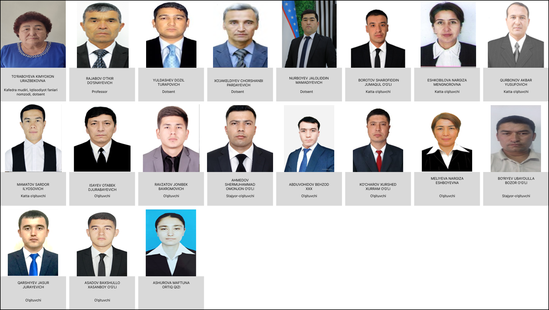 Kafedra asosiy shtatda 19 nafar professor-o‘qituvchi faoliyat ko‘rsatadi. Ilmiy salohiyat 40% ni tashkil etadi. Ulardan 1 nafar vb Professor, 5 nafar PhD, 1 nafar i.f.n, 2 nafar katta o‘qituvchi, 6 nafar o‘qituvchi va 4 nafar stajyor o‘qituvchilar 1 nafar Tashqi o‘rindosh faoliyat yuritib kelmoqda.
