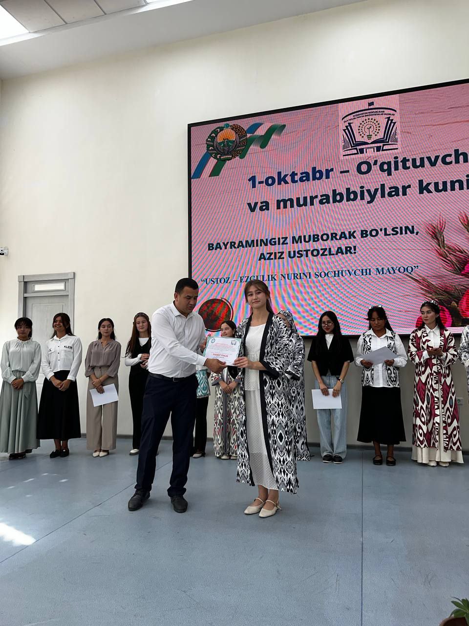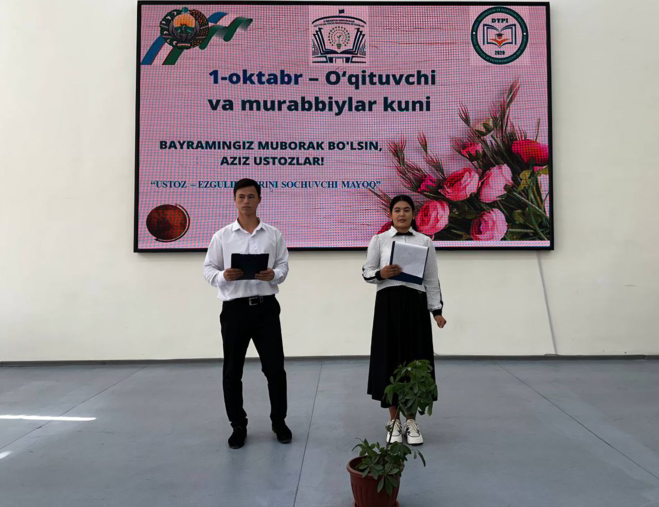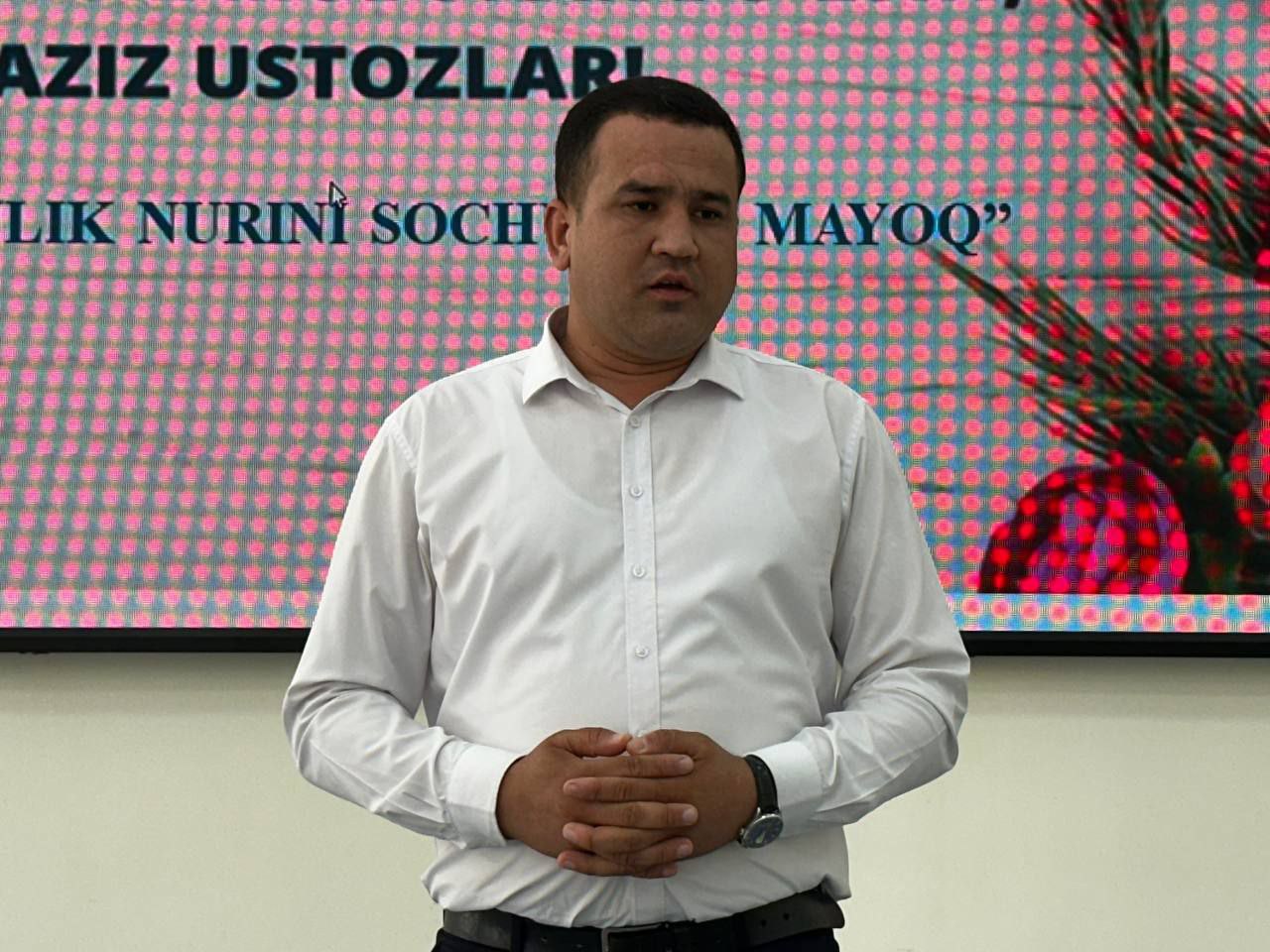 🎤 Tadbirni fakultet dekani Maqsud Toshboboyev ochib berib, o‘qituvchi va murabbiylarning fidokorona mehnati, jamiyat taraqqiyoti hamda yoshlar tarbiyasidagi o‘rni haqida so‘z yuritdi. Shuningdek, ustoz va muallimlar qadr-qimmati haqida to‘xtalib, soha vakillarini bayram bilan tabrikladi.
