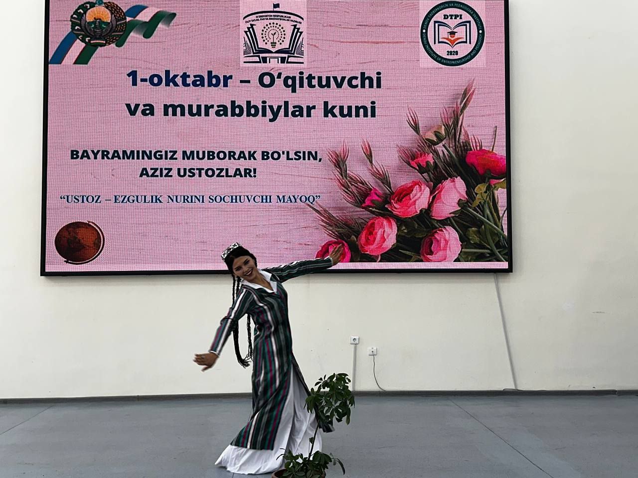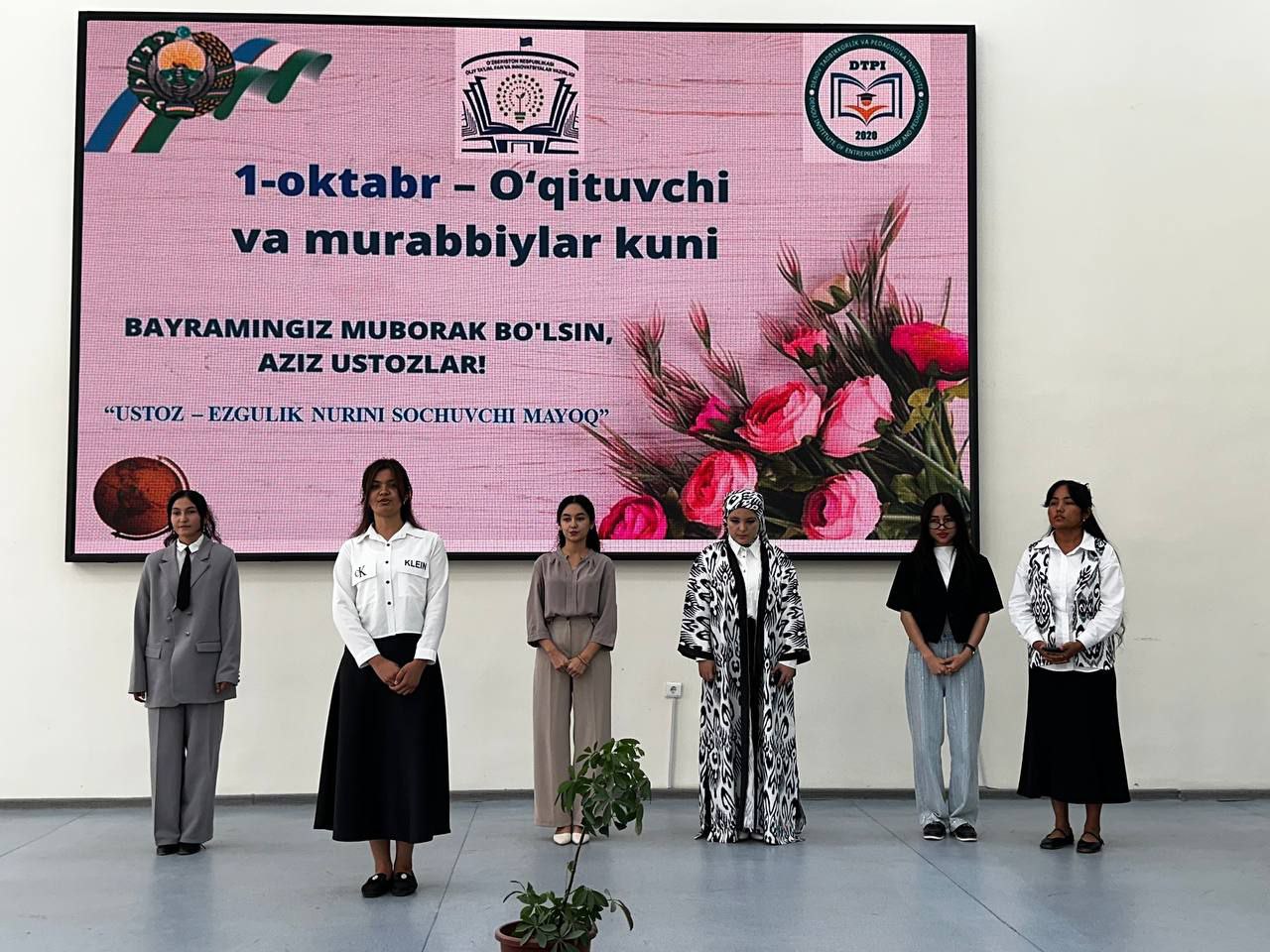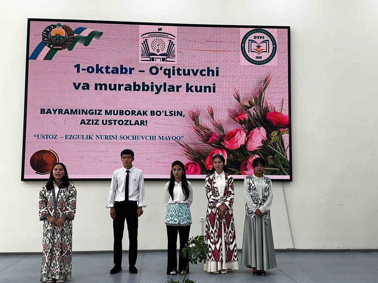 🎤 Tadbirni fakultet dekani Maqsud Toshboboyev ochib berib, o‘qituvchi va murabbiylarning fidokorona mehnati, jamiyat taraqqiyoti hamda yoshlar tarbiyasidagi o‘rni haqida so‘z yuritdi. Shuningdek, ustoz va muallimlar qadr-qimmati haqida to‘xtalib, soha vakillarini bayram bilan tabrikladi.
