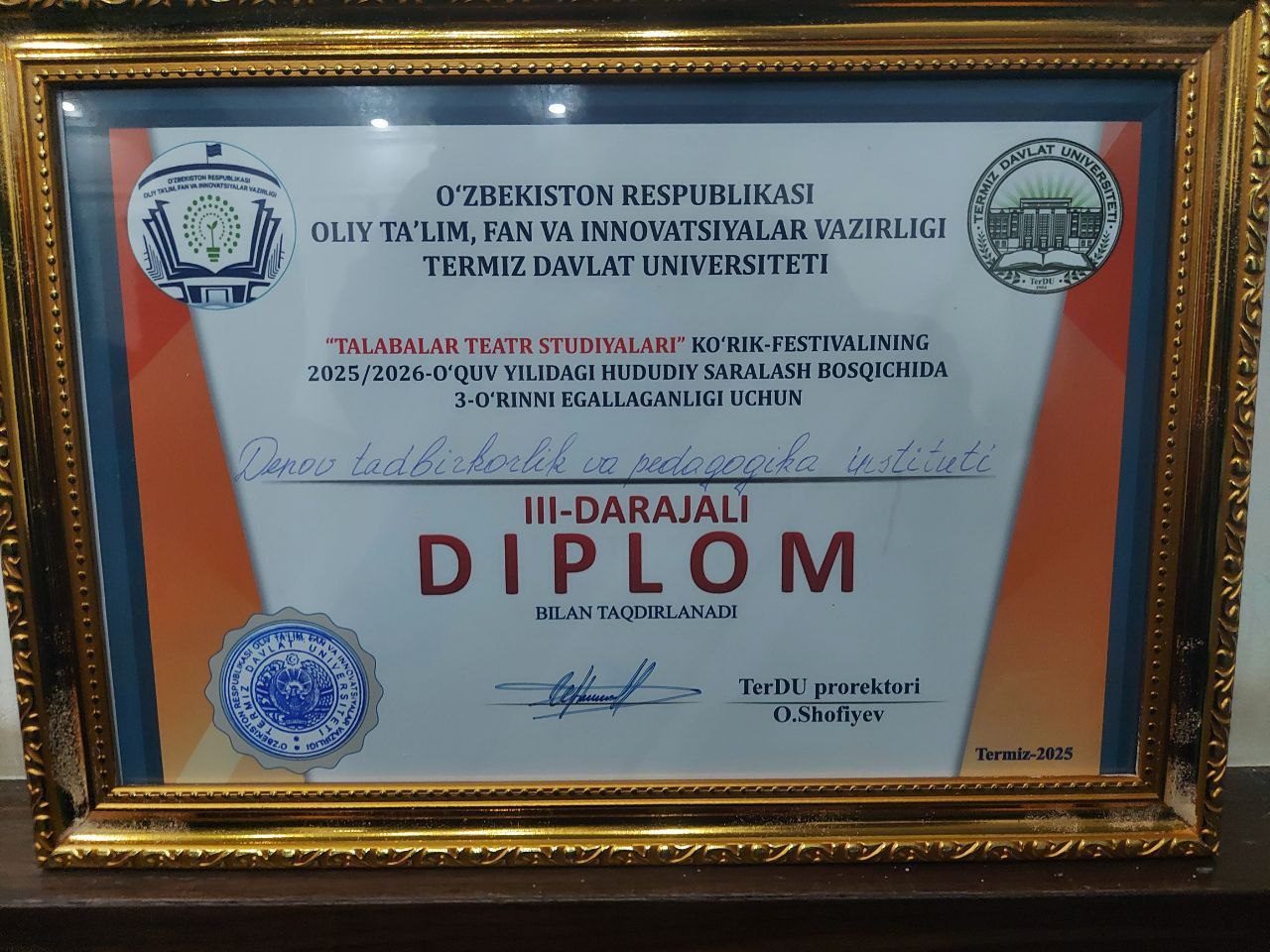 📌 Ushbu nufuzli tanlovda Denov tadbirkorlik va pedagogika institutining “Turon” talabalar teatr studiyasi jamoasi ham faol ishtirok etdi. Jamoa a’zolari ijodiy chiqishlari, sahnadagi uyg‘unlik va mazmunli g‘oyalar orqali hakamlar hay’atining e’tirofiga sazovor bo‘lishdi. Natijada “Turon” talabalar teatr studiyasi faxrli 3-o‘rinni qo‘lga kiritib, institut sha’nini munosib himoya qildi. Bu yutuq yosh ijodkorlar uchun kelgusidagi muvaffaqiyatlarga mustahkam zamin bo‘lib xizmat qiladi.