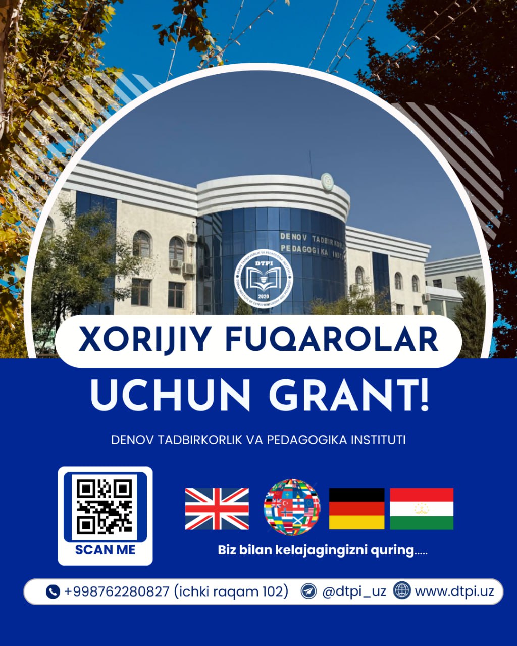 Denov tadbirkorlik va pedagogika instituti sizni o‘qishga taklif etadi! Bu yil 5 nafar xorijiy fuqarolar uchun maxsus GRANT o‘rinlari ajratildi! ✨